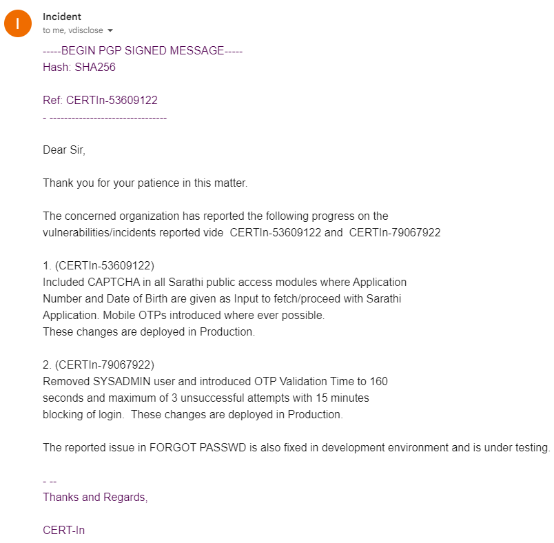 The fix was confirmed on January 25th, 2023, however, I waited for about a month before disclosing because of that last line in their fix confirmation. Either way, according to CERT-IN, none of these vulnerabilities should be reproducible anymore.