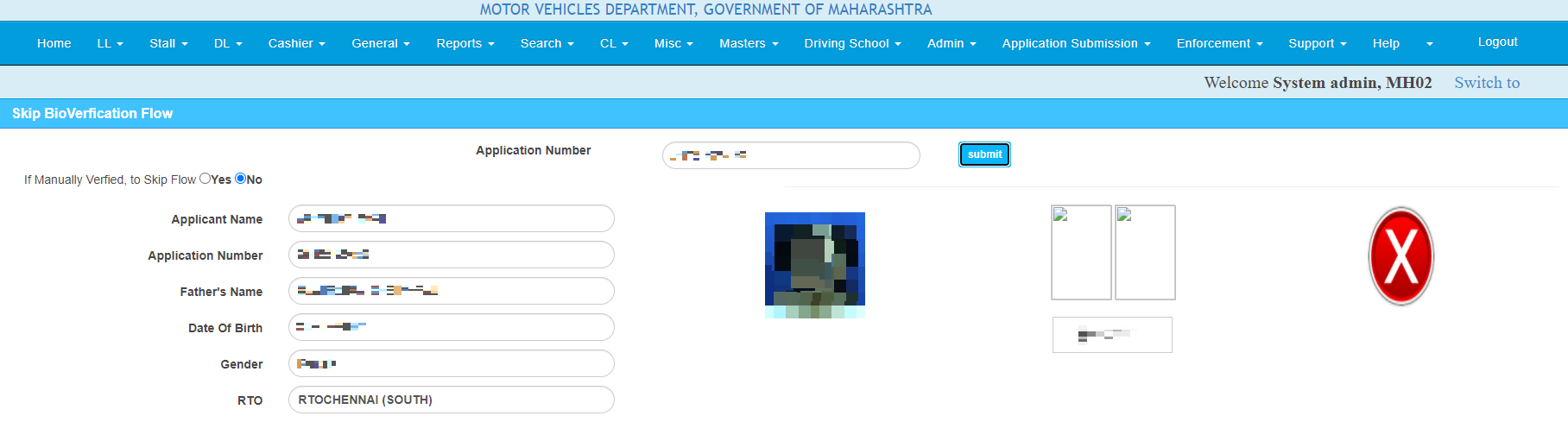 - Skip Bio Verification Flow: The administrator was able to access any application by entering it’s number. Once entered, the administrator gets all info related to the application, and can decide to click on the “Skip Flow” option to skip the in-person Bio Verification checks.